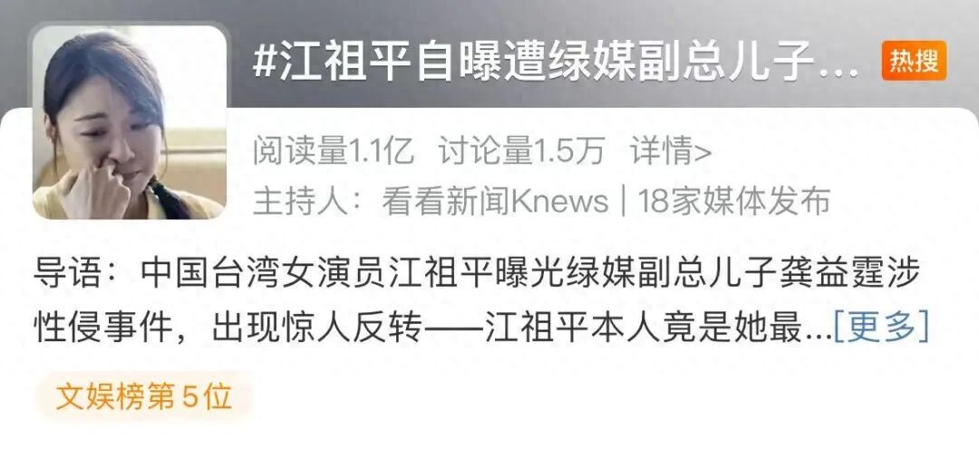 江祖平本人竟然就是她最初爆料中所稱的受害女演員,話題迅速?zèng)_上熱搜。