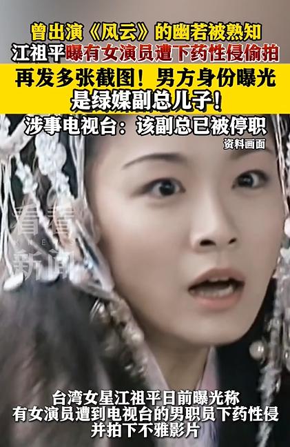 據(jù)看看新聞Knews綜合報(bào)道,日前,臺(tái)灣女星江祖平曝光稱有女演員遭到電視臺(tái)的男職員下藥性侵,并拍下不雅影片。
