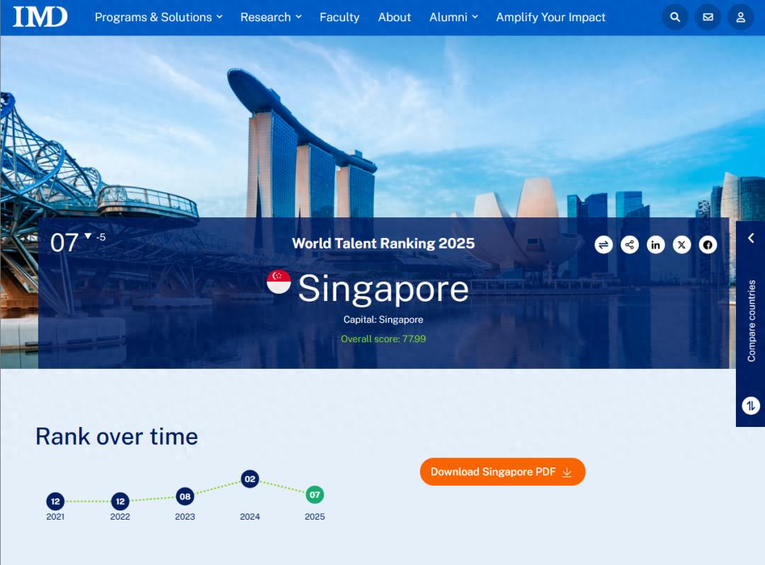 根據瑞士洛桑管理學院世界競爭力中心(IMD)公布的最新排行,新加坡在全球人才競爭力排名中,跌落5位,從全球第二掉至全球第七。香港則成為新的亞洲一哥。