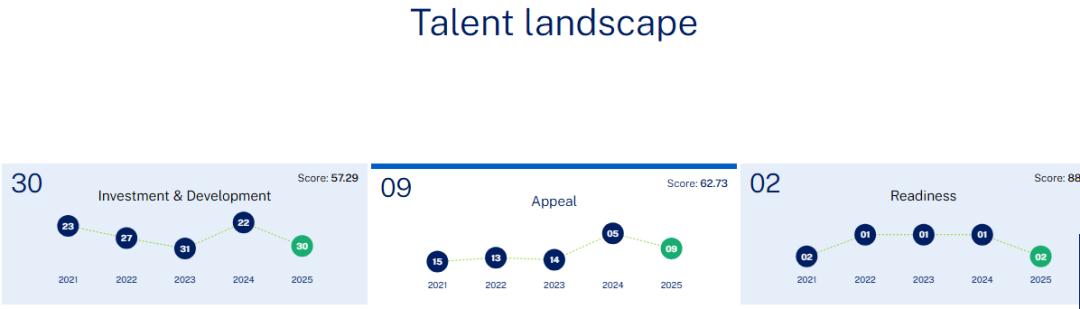 新加坡在投資與發展方面跌幅最大,從2024年的第22位跌至第30位。該指標考慮了公共教育支出、師生比例以及學徒制實施情況等因素。