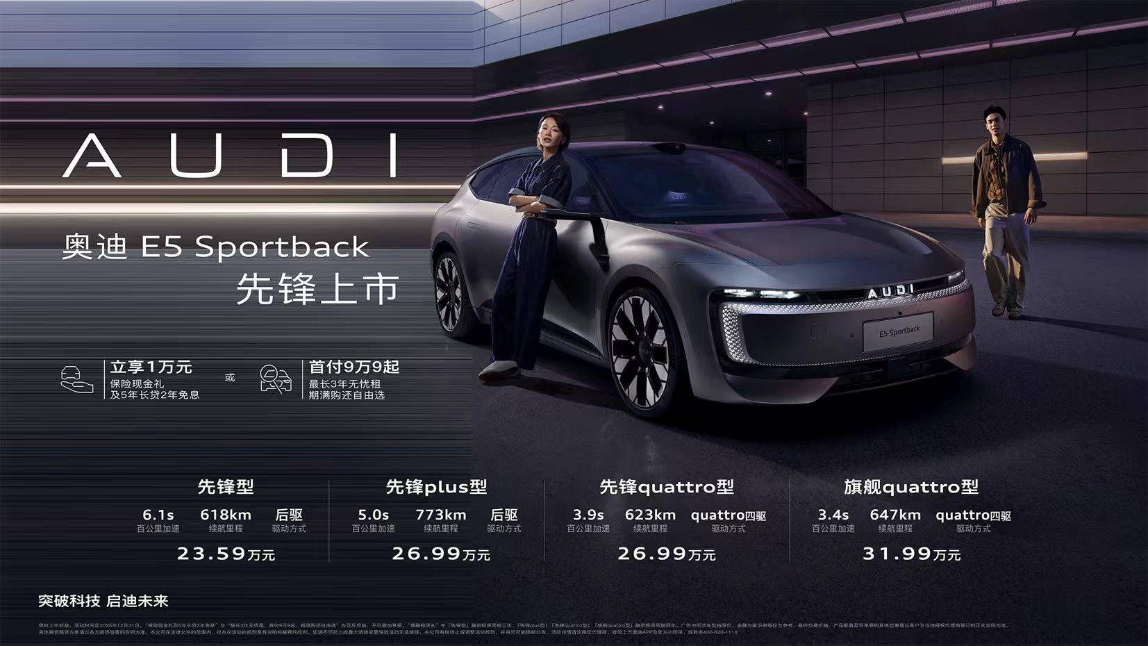 2025年9月16日,正式上市,全系推出先鋒型、先鋒plus型、先鋒quattro型和旗艦quattro型共4款配置車型,臻享價23.59萬起,并享萬元保險現金權益,意味著E5 Sportback正式進入22萬級區間,上市即開啟交付,并且,奧迪E5 Sportback 上市30分鐘,訂單已斬獲10153臺!