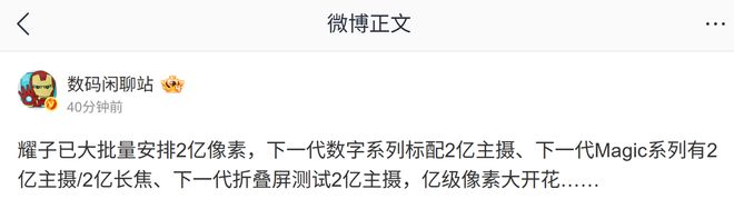 博主表示,榮耀已經大批量安排 2 億像素傳感器,下一代數字系列手機標配 2 億像素主攝、下一代 Magic 系列有 2 億像素主攝 / 長焦鏡頭,下一代折疊屏則正在測試 2 億像素主攝,號稱“億級像素大開花”。