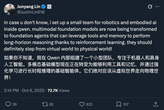 昨天,阿里通義千問大語言模型負責人林俊旸在社交媒體上官宣,他們在 Qwen 內部組建了一個小型機器人、具身智能團隊,同時表示「多模態基礎模型正轉變為基礎智能體,這些智能體可以利用工具和記憶通過強化學習進行長程推理,它們絕對應該從虛擬世界走向物理世界」。