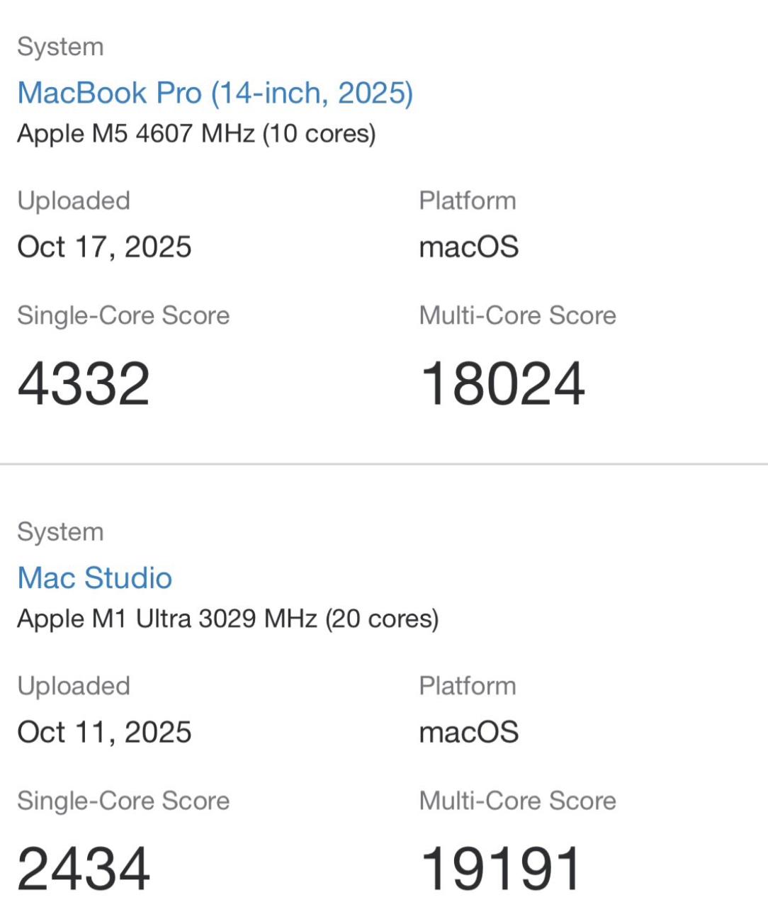 目前,搭載了 M5 芯片的 MacBook Pro 機型已現身 Geekbench 6,顯示 M5 芯片多核跑分達到 18024 分,幾乎追平 2022 年的 M1 Ultra 芯片;而單核跑分為 4332 分,是 M1 Ultra 的 1.78 倍。