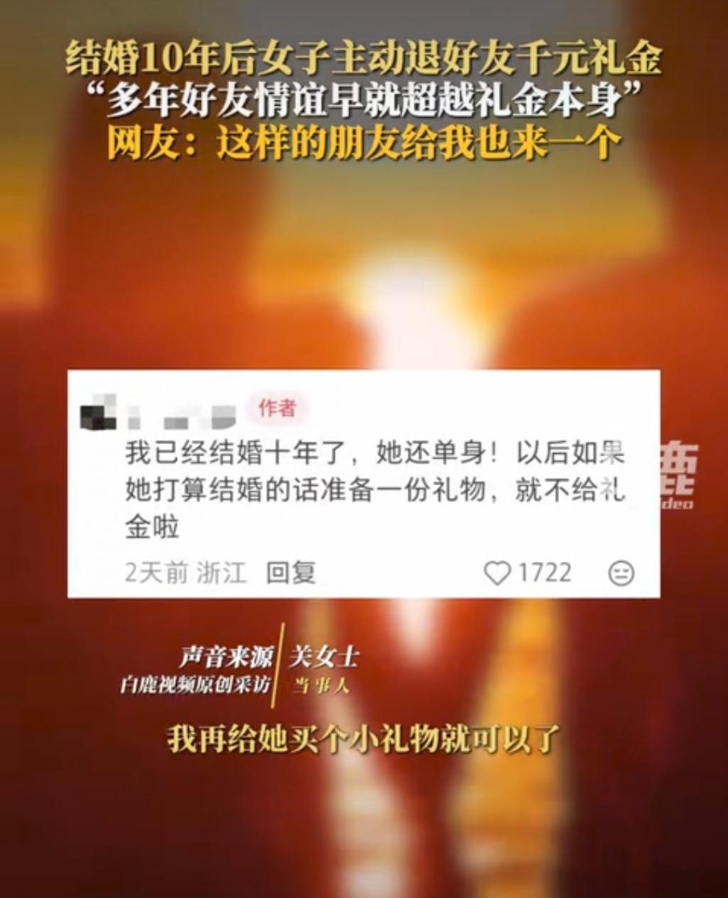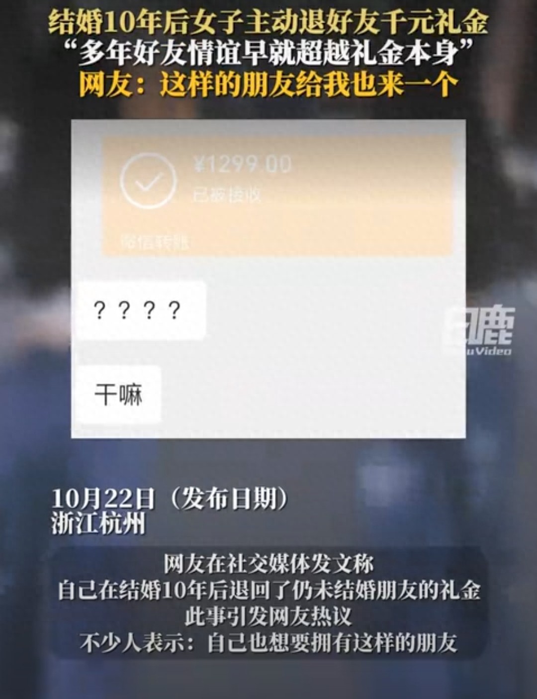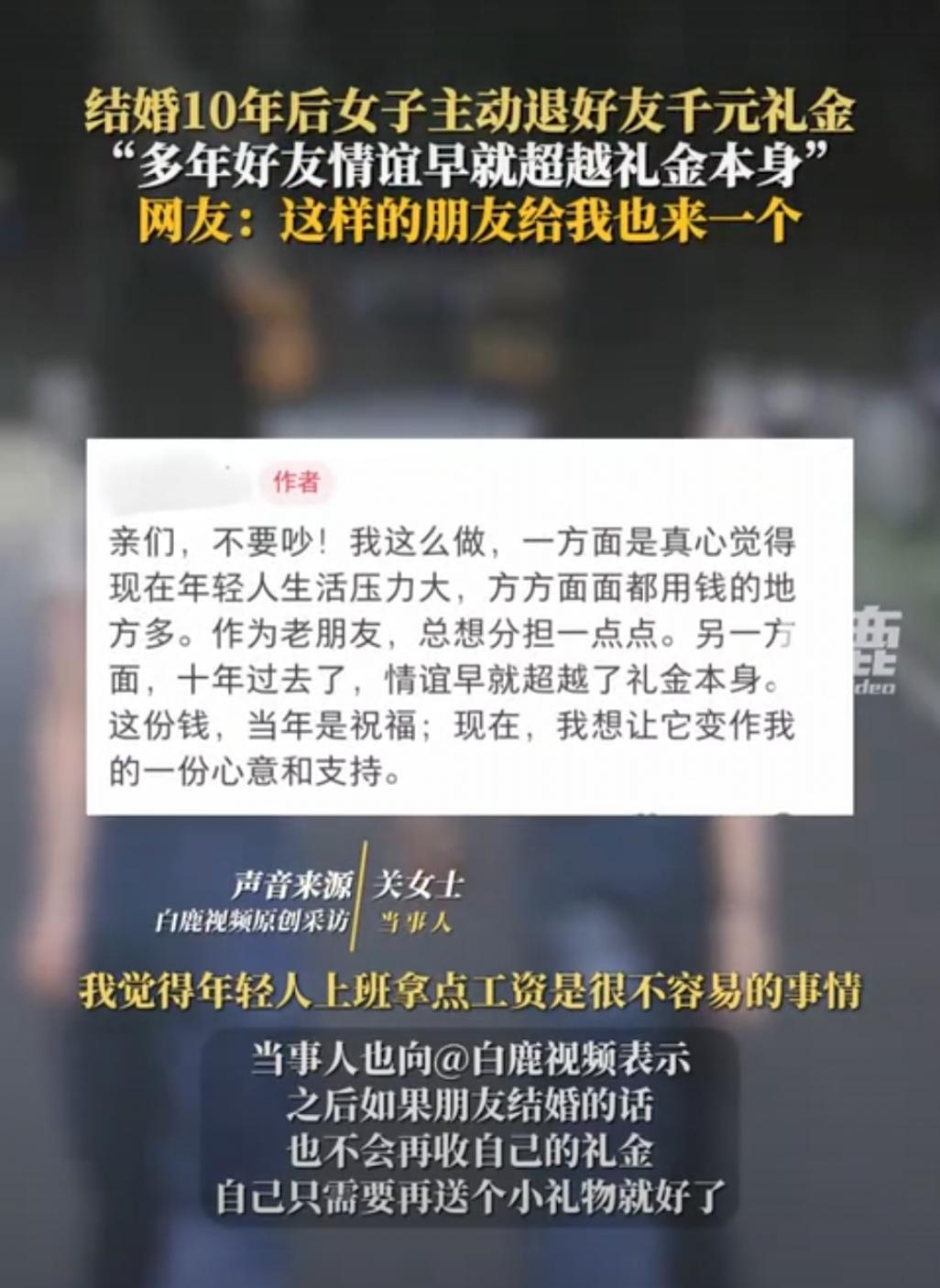 2025年10月24日傍晚6點(diǎn)22分,一段視頻把“人情往來”的話題炸上了熱搜——結(jié)婚十年的女子,主動將當(dāng)年好友隨的千元禮金退了回去,只說“這么多年的情誼,早不是錢能衡量的”。