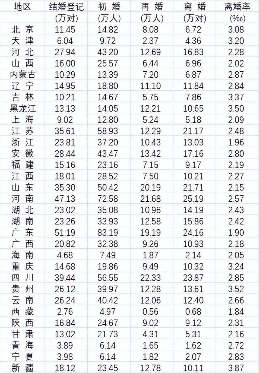 2024年31個省份結婚登記、初婚、再婚、離婚及離婚率數據。數據來源:《中國統計年鑒2025》