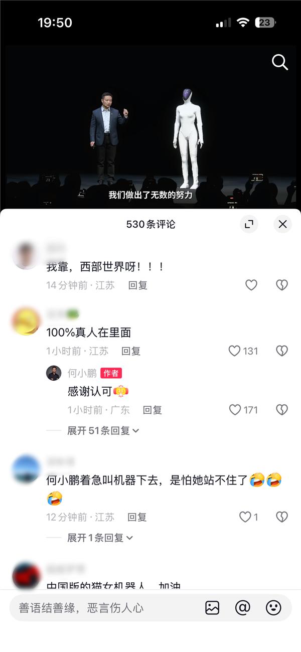 有網(wǎng)友評論道:“100%真人在里面”。對此何小鵬回應(yīng)了四個字:“感謝認可。”