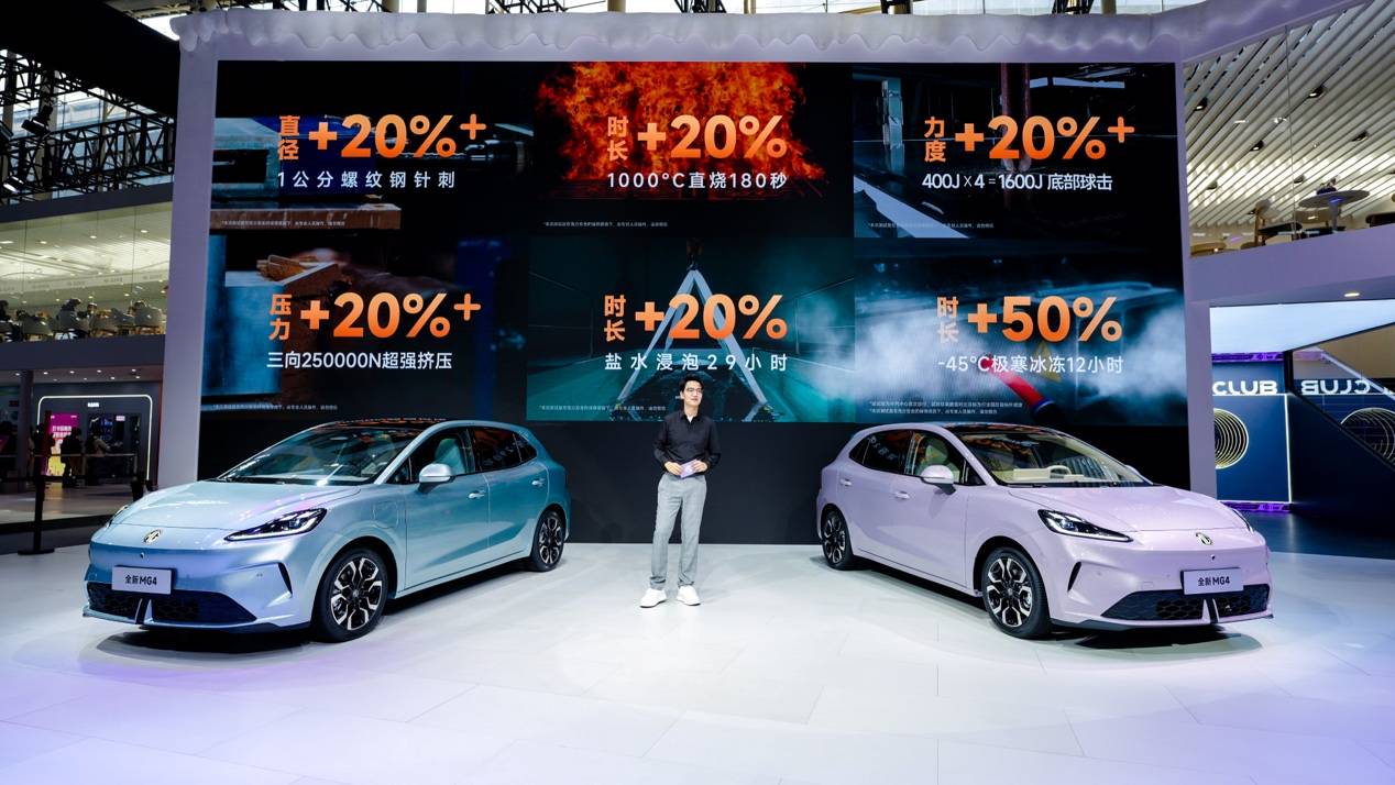 據介紹,在中汽中心的安全測試中,該電池成功通過了螺紋鋼穿刺、電芯三向極限擠壓、高鹽腐蝕液、極寒冰凍、底部球擊以及高溫火燒等六大測試項目。值得一提的是,本次測試標準在中汽中心原有最高標準基礎上進一步加碼20%以上,大幅超越最新版國標,充分證明全新MG4半固態電池安全性能提升超過20%。